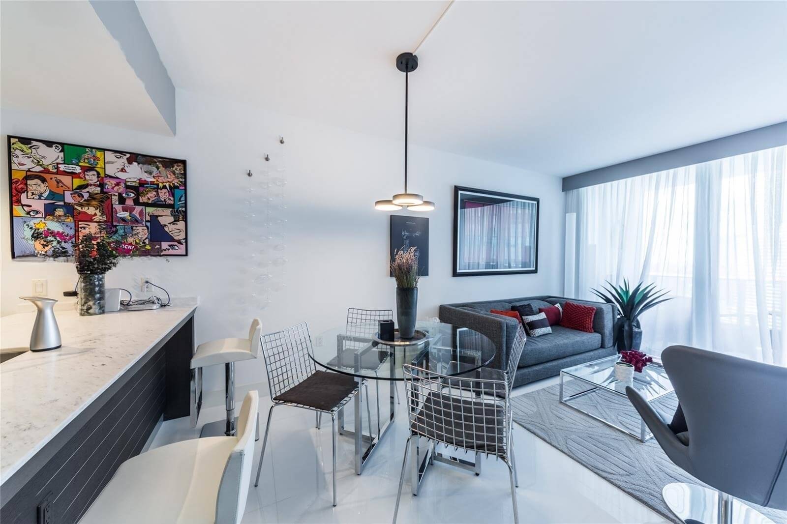 The unit features sub-zero & Miele appliances and white porcelain floors overlooking city views.